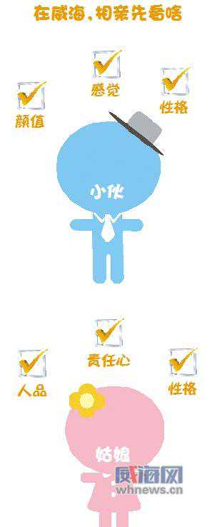 记者以罗玲的婚恋介绍所里的男女会员各100名为样本进行调查,发现男女要求也不尽相同。在经济条件、人品、颜值、感觉、责任心、性格、职业、收入、家庭等选项中,更多的威海小伙把颜值位列第一,其次是性格和感觉。