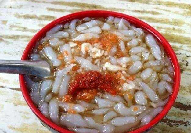 蛙鱼,形同小鱼的面食,凉粉的一种,是很多徐州人童年的最爱。顺滑的口感像小鱼游过唇齿,配上榨菜、甜醋,吃起来清凉爽滑酸甜。