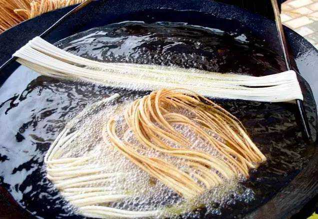 炸馓子咸淡适中,馓条纤细,吃起来酥脆味香。守在油锅边,看着盘条、下撑、搓条,每一个工序都是一门技术。