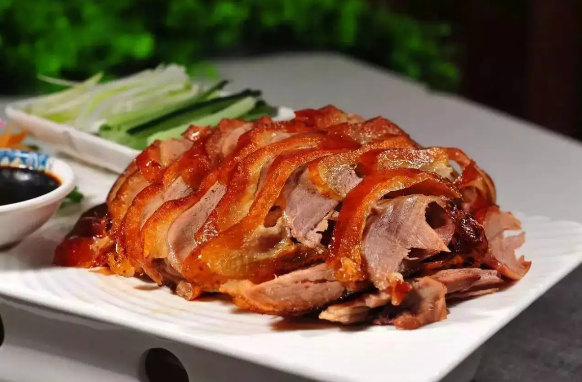 宜良的烧鸭是当地的传统美食了,也是云南人从小吃到大的一道菜。烧鸭是切成块搭配蘸酱汁和黄瓜、葱丝等小菜一起装盘上的,卖相十分好看。