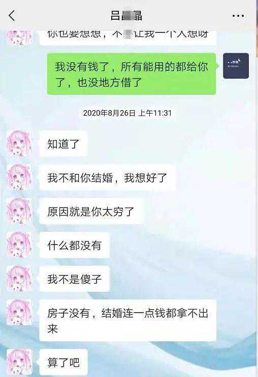 2020年8月,他再一次催促吕某晶和自己领证结婚,这一次,吕某晶明确表示不会和他结婚,并嫌弃他一无所有,“你太穷了,什么都没有,我不是傻子!”这一句话,犹如晴天霹雳,让他彻底放弃了结婚的幻想。他要求对方归还自己的彩礼,但吕某晶称钱已经用完了,没有钱退给他。