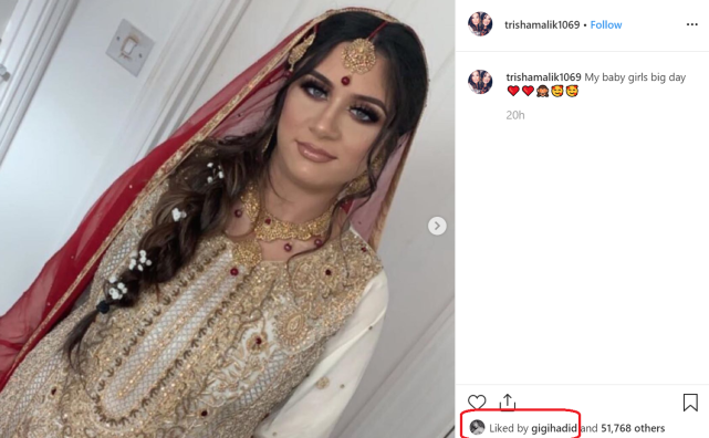 虽然婚礼就在英国举行,但泽恩没有参加,婚礼照片中也没有他的身影,就连妈妈分享照片的点赞中,也找不到他的名字,倒是有他的前女友吉吉。