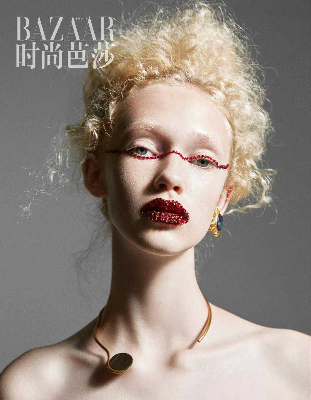 如果不想要太夸张的眼妆和唇妆,我们可以选择红色眼线笔来勾化内眼线或眼尾,看起来会很俏皮。唇部的水钻可以选择两颗分别贴在上下唇中间,再配上哑光大红唇,生活中也可以成为酷酷的女孩。