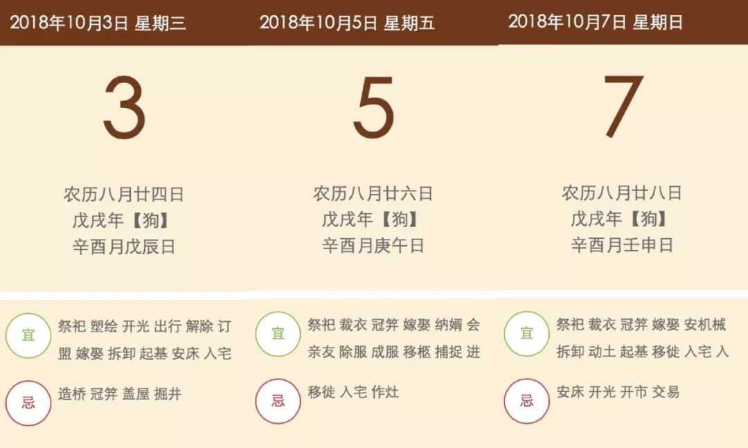 芭姐为正在准备婚礼的小仙女掐指一算,婚礼的黄道吉日就是10月3日、5日和7日。