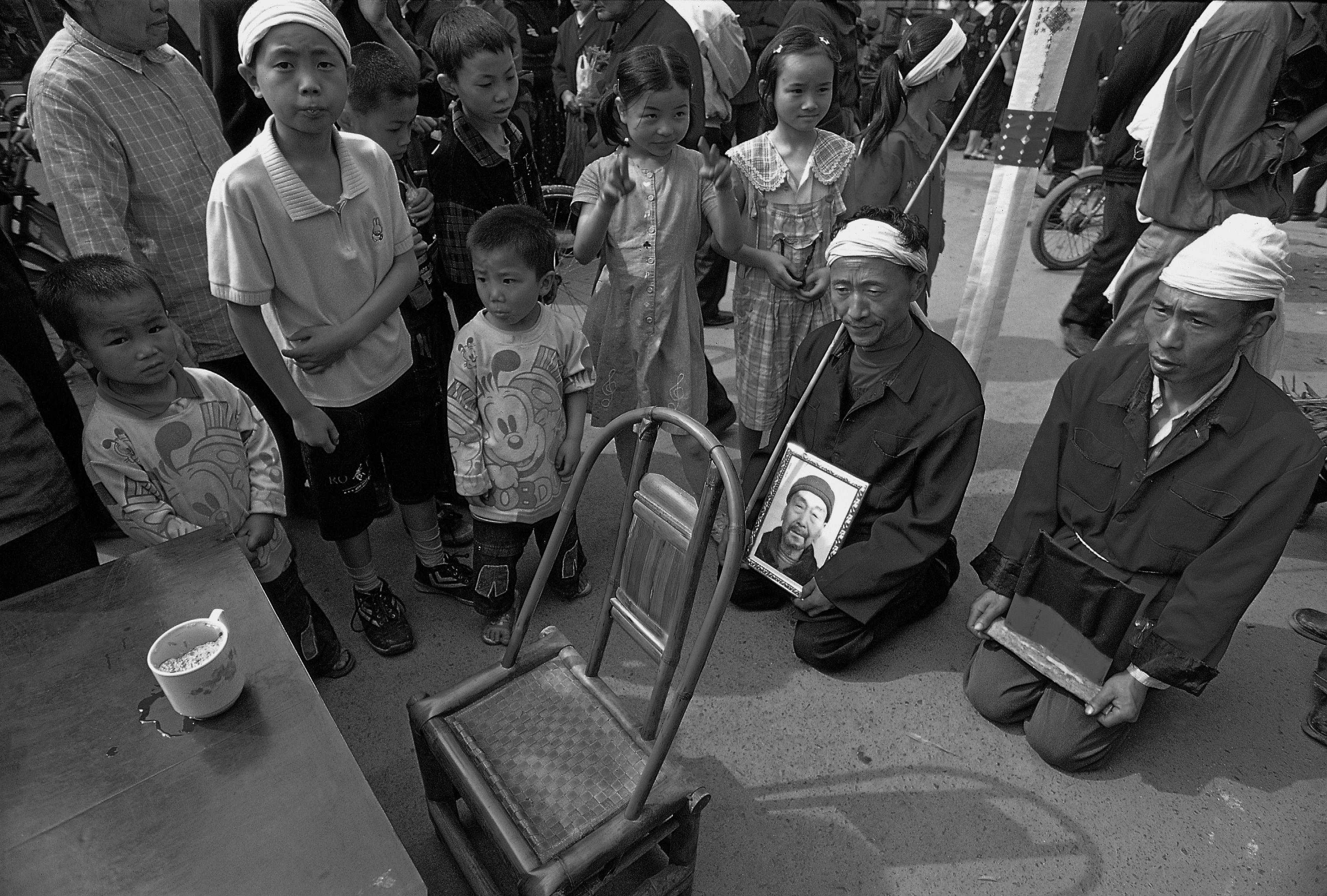 2002年,在四川省成都市温江区寿安镇的一间茶铺门前,端着灵牌送葬的人们跪在茶桌前,为刚身故的老茶客奉上最后一杯茶。新华社发(陈锦摄)