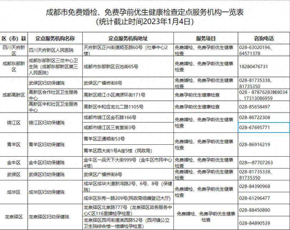 双流区:按照《成都市双流区卫生健康局关于印发成都市双流区自愿免费婚前医学检查项目实施方案的通知》,在完全自愿的前提下,凡符合《中华人民共和国婚姻法》和《婚姻登记条例》规定,男女双方或一方户籍或居住地在成都市(四川省),并拟在双流区内登记结婚的婚姻登记当事人,均可在我区定点婚检机构(双流区妇幼保健院)享受免费婚检一次。免费婚检项目为:体格检查、实验室检查和影像学检查等共计14项。拟婚当事人双方可以持有效证件(如身份证、军官证、户口簿等)到双流区妇幼保健院体检科进行免费婚检。
