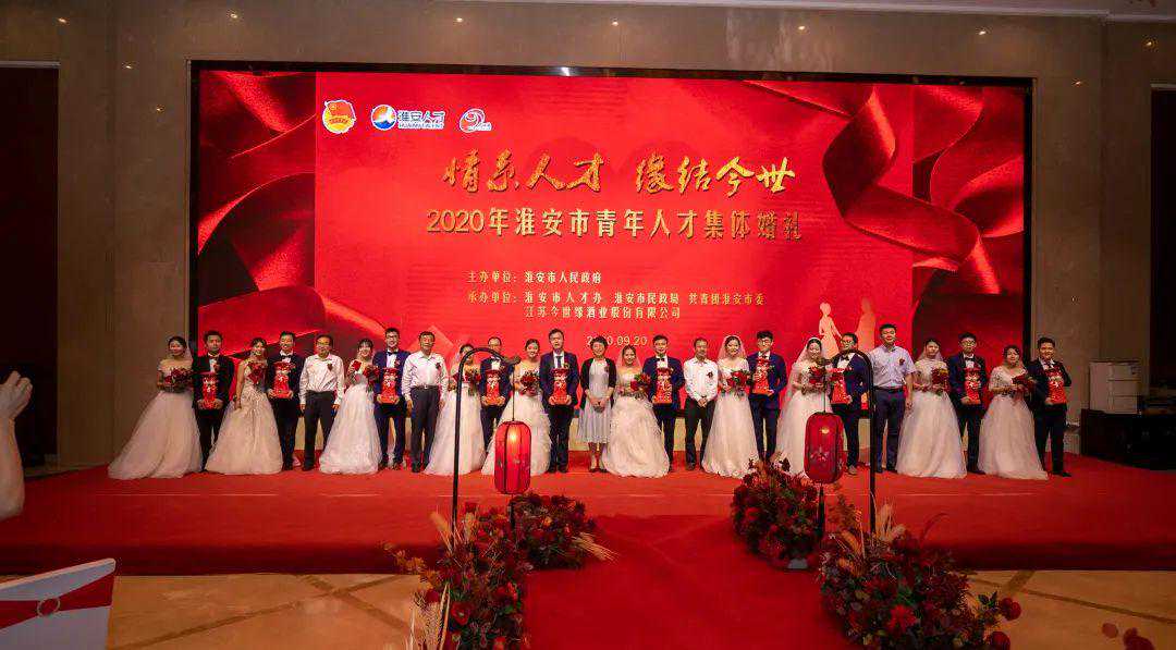 2020年9月20日是我市首个“淮安人才日”。市人才办、市民政局、团市委、江苏今世缘酒业股份有限公司举办了我市第一个“青年人才集体婚礼”。淮安市人民政府副市长王红红出席活动并为新人证婚,在各位领导嘉宾的见证与祝福下,10对青年人才新人共同开启了他们的幸福生活!
