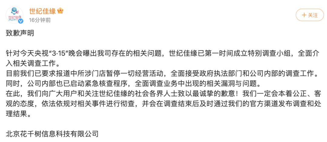 3月15日晚,世纪佳缘发布致歉声明:针对今天央视“3·15”晚会曝出我司存在的相关问题,世纪佳缘已第一时间成立特别调查小组,全面介入相关调查工作。