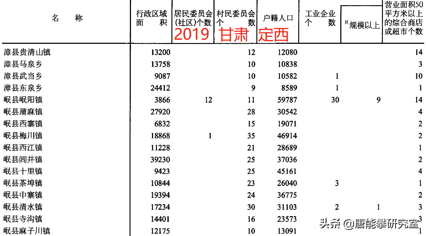甘肃定西通渭、渭源、陇西3县51镇人口、土地、工业…最新统计