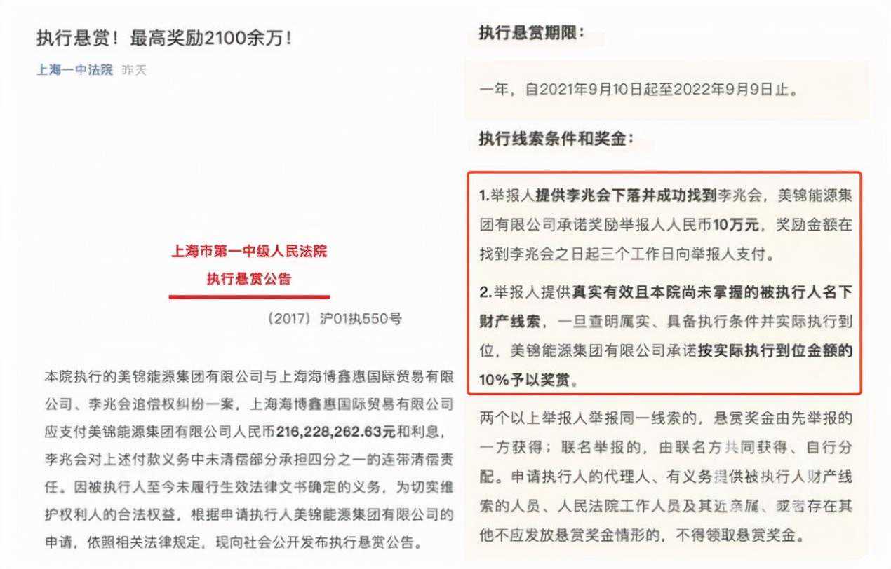 9月15日,上海市第一中级人民法院发布一则执行悬赏公告,最高悬赏2100余万寻找失信人李兆会。执行悬赏期限自2021年9月10日至2022年9月9日,为期一年。