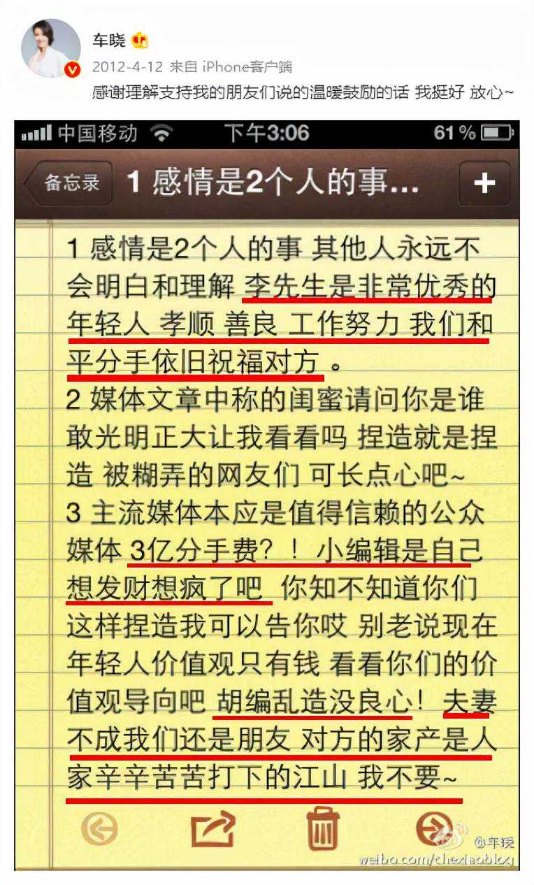 从明面上看,两个人还是保持了该有的体面,离婚后的车晓不仅从未给前夫差评,还曾在个人社交平台上发文送出祝福。