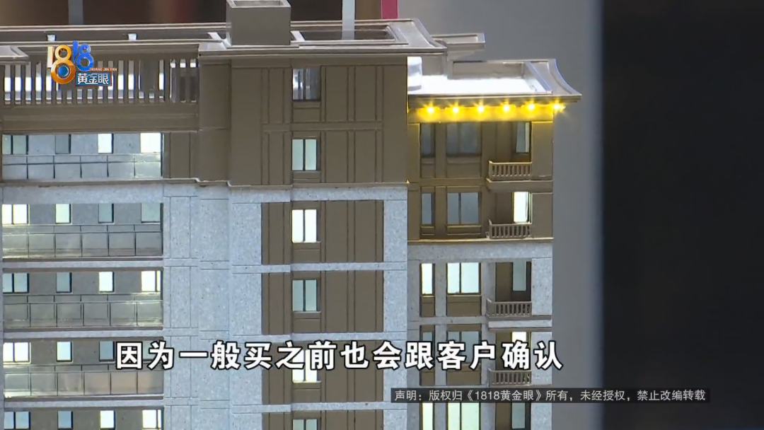 方女士:买给我儿子,我儿子在读大学了嘛,打算让他做婚房的。2月12日吧,晚上来看的,那时候那边绿色的网还遮着,因为我看不出上面啥情况,只是沙盘大致看了一下,就是方方正正的,没有像现在这样弧度这么大的。现在我一看,它网拿掉了,这抬起头来怎么感觉不一样了,好像我们北面的一个房间,两个卫生间,一个厨房,全部光线被挡住了。