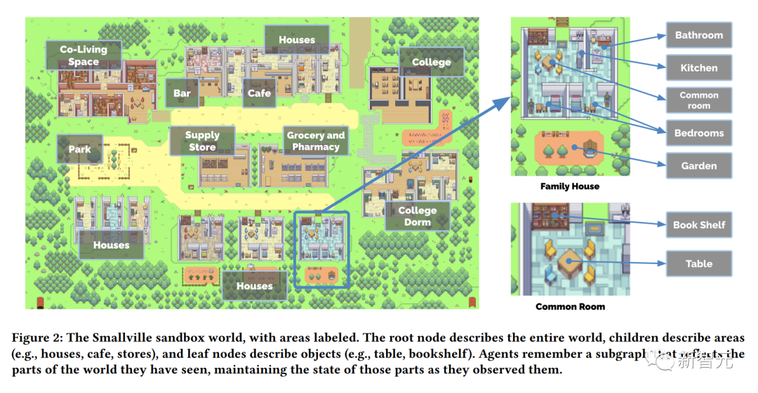 在这个名为Smallville的沙盒世界小镇中,区域会被标记。根节点描述整个世界,子节点描述区域(房屋、咖啡馆、商店),叶节点描述对象(桌子、书架)。