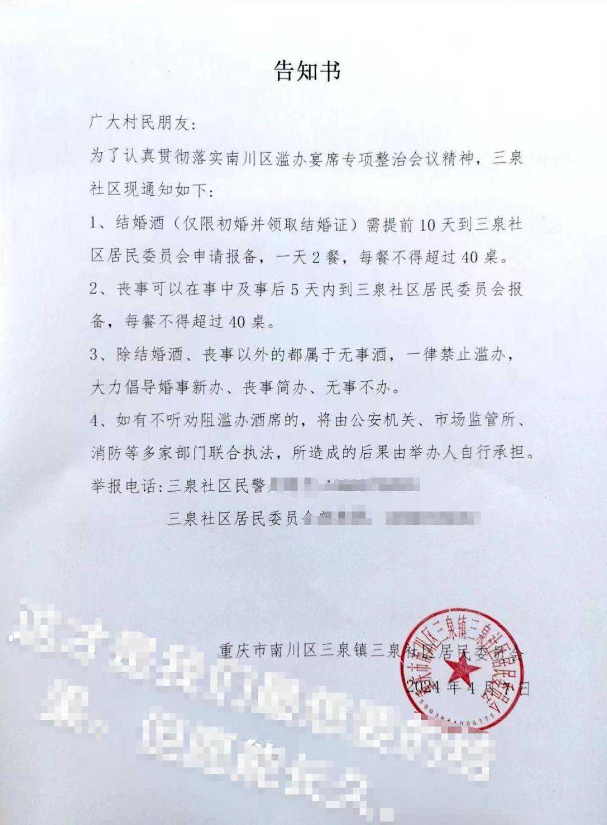 南川区三泉镇三泉社区居委会曾于4月7日发布告知书,称为了认真贯彻落实南川区滥办宴席专项整治会议精神,辖区内结婚酒(仅限初婚并领取结婚证)需提前10天到三泉社区居民委员会申请报备,一天2餐,每餐不得超过40桌。丧事可以在事中及事后5天内到三泉社区居民委员会报备,每餐不得超过40桌。除结婚酒、丧事以外的都属于无事酒,一律禁止滥办,大力倡导婚事新办、丧事简办、无事不办。