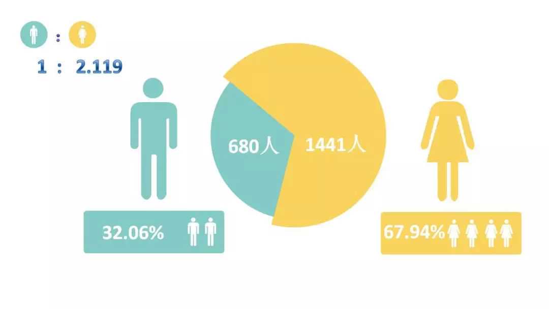 2019级录取男生680人,占比32.06%;女生1441人,占比67.94%。新生男女比例为1:2.119,与往年相比无明显变化。总体上,萌新小仙女还是偏多一点的。