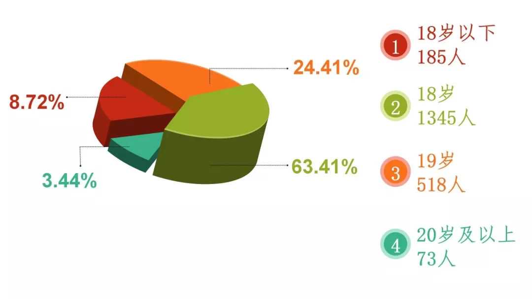 2019级18岁的萌新人数最多,为1345人,占比63.41%。