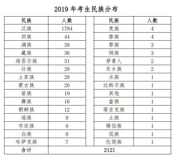 我校2019年录取的少数民族考生为337人,占比15.89%。共涉及29个少数民族,其中人数排名前十的少数民族为: