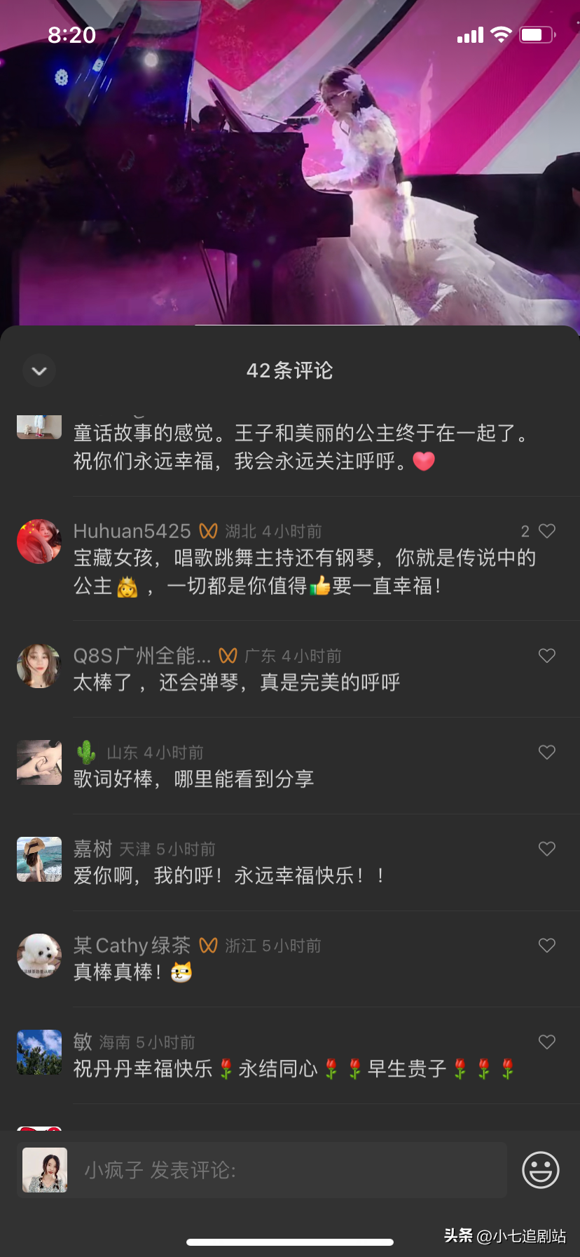 万花城堡,是每一个女孩的期待。用绿植与鲜花装饰了婚礼的场地,做出了大型的爱心装饰。在闪耀的灯光下,在鲜花的衬托中,呼呼坐在钢琴前弹唱了一首《最重要的决定》,既浪漫又让人感动。坐在钢琴前的呼呼,穿白色蕾丝婚纱,美得像个小精灵。