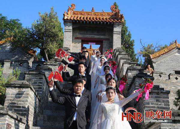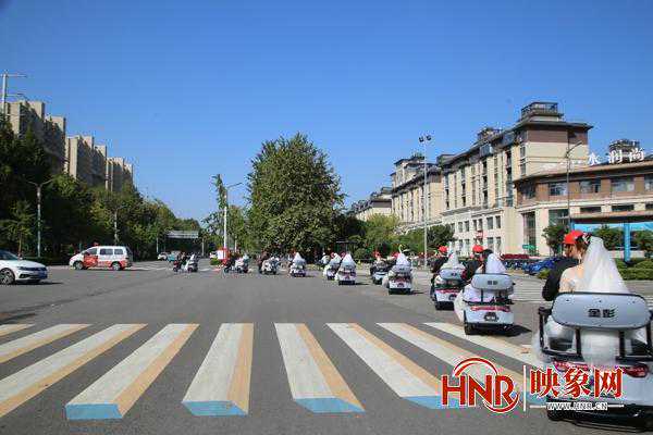 一对对新人身穿婚纱礼服,新郎手持国旗,新娘手捧玫瑰,现场没有乐队,没有豪华婚车,十对新人乘坐环保电动三轮,在宣传车的引导下,在紫气大道、五河两岸大道游行,并走进明道宫景区拜谒道家鼻祖老子。