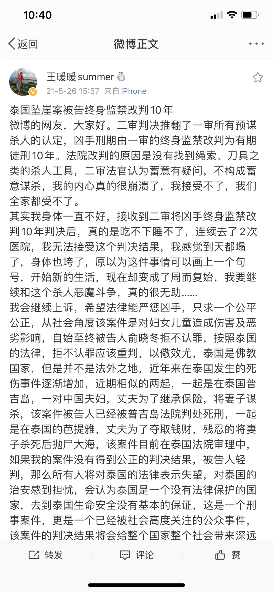2021年5月25日,王暖暖接到法院二审判决文书,二审宣判结果直接推翻一审,俞晓东的定罪由蓄意谋杀未遂改为无预谋杀人。