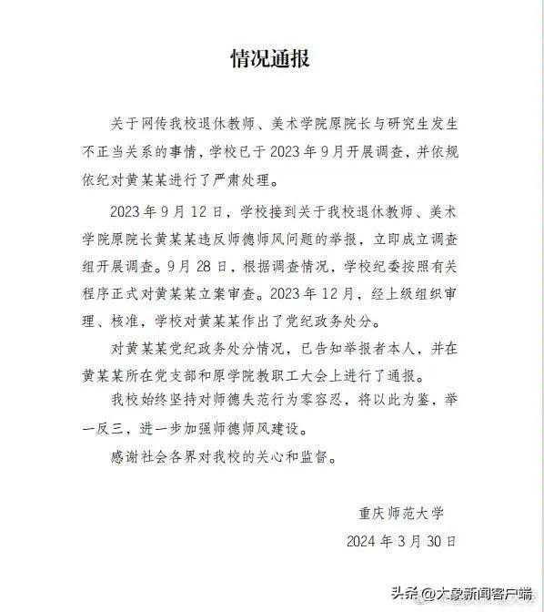 3月31日凌晨,重庆师范大学通报“美院原院长与研究生发生不正当关系”:对黄某某作出党纪政务处分。关于网传该校退休教师、美术学院原院长与研究生发生不正当关系的事情,学校已于2023年9月开展调查,并依规依纪对黄某某进行了严肃处理。