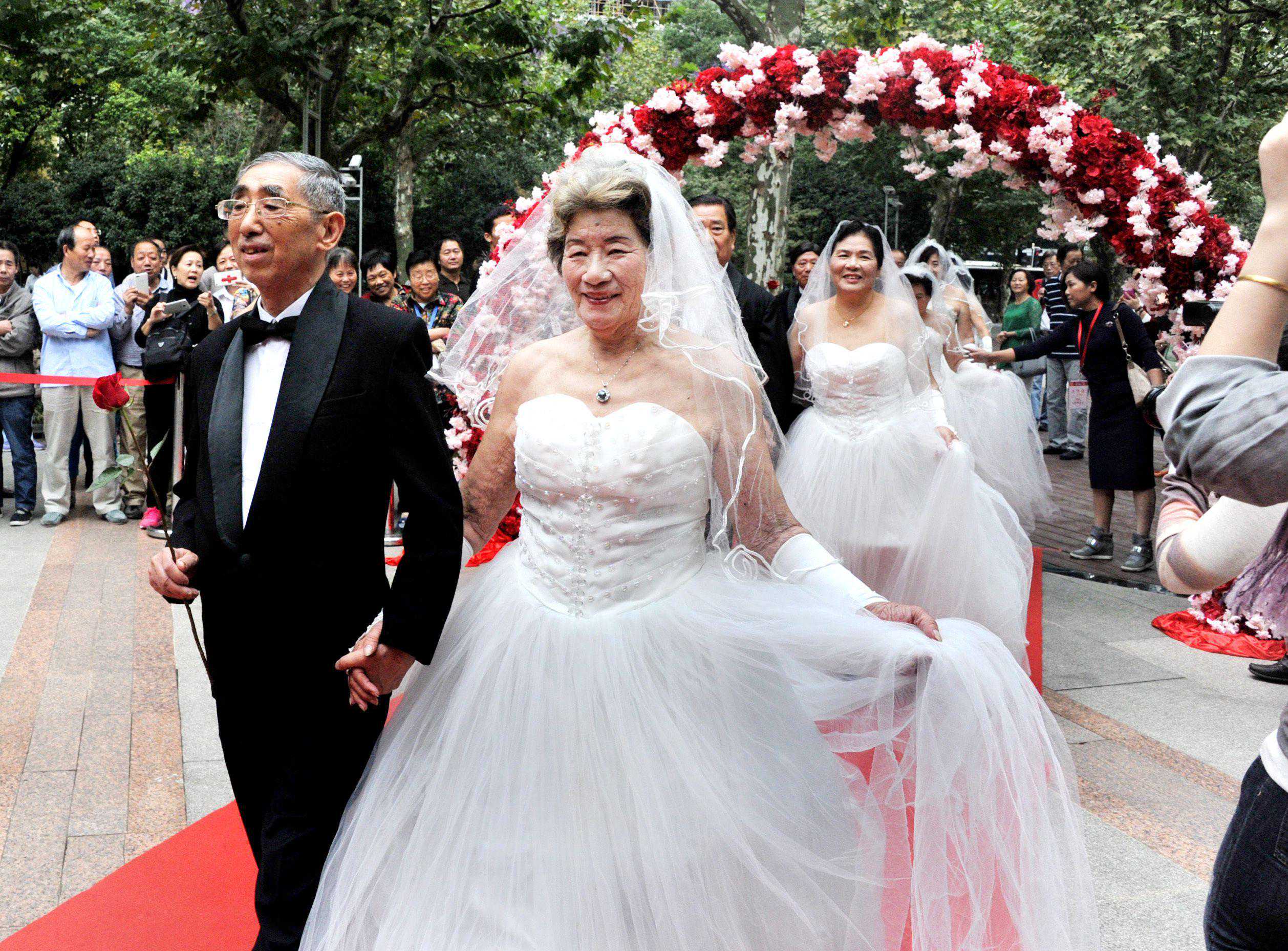 资料图。2016年10月,“精彩老来伴”集体婚礼在上海的淮海公园举行,六对“新人”获得满满的祝福,其中年龄最大的一对“耄耋新人”已达八旬。图/ICphoto