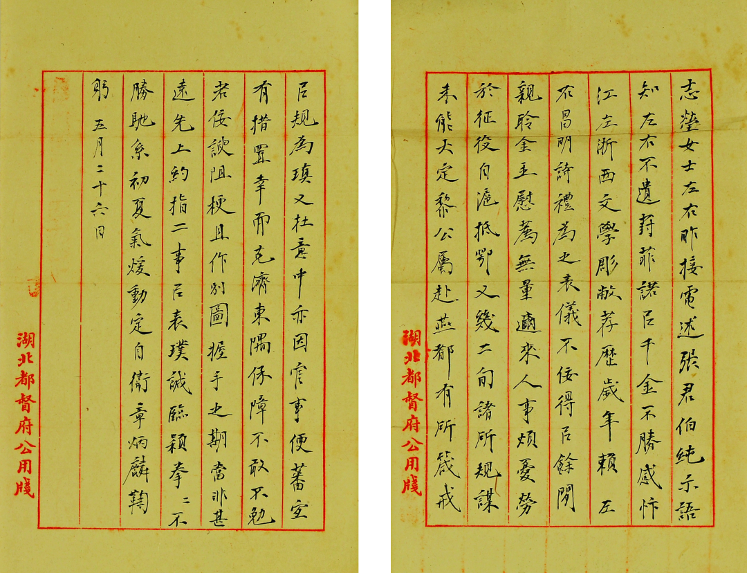 昨接电,述张君伯纯示语,知左右不遗葑菲,诺以千金,不胜感忭。江左、浙西文学凋敝,荐历岁年,赖左右昌明诗礼,为之表仪。不佞得以余闲,亲聆金玉,慰荐无量。迩来人事烦忧,劳于征役,自沪抵鄂,又几二旬,诸所规谋,未能大定。黎公属赴燕都,有所箴戒。以规为瑱,又在意中。亦因官事便蕃,宜有措置。幸而克济,东隅保障,不敢不勉。若佞谀阻梗,且作别图。握手之期,当非甚远。先上约指二事,以表璞诚。临颖拳拳,不胜驰系。初夏气暖,动定自卫。