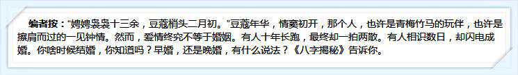 确定婚姻的早晚,先观其大象,有个大体的概数,之后再根据岁运确定具体的婚期。