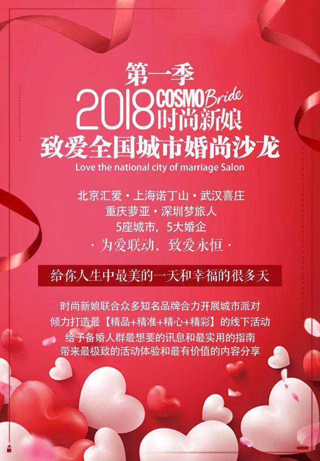 时尚新娘COSMOBride作为国内最具权威、最受欢迎的婚尚生活全媒体品牌,拥有强大的品牌号召力及婚尚联盟平台内优秀的一线婚礼资源。正值时尚新娘COSMOBride致爱10周年之际,我们将联手全国各地优秀高端婚礼机构、婚尚品牌,从心出发,以「为爱联动致爱永恒」为理念,打破原有的沙龙模式,倾力打造最[精品+精准+精心+精彩]的城市沙龙活动,以城市为出发点,结合时尚新娘专业婚尚经营优势,展现城市独特魅力的同时,为准新人送上权威的筹婚攻略。