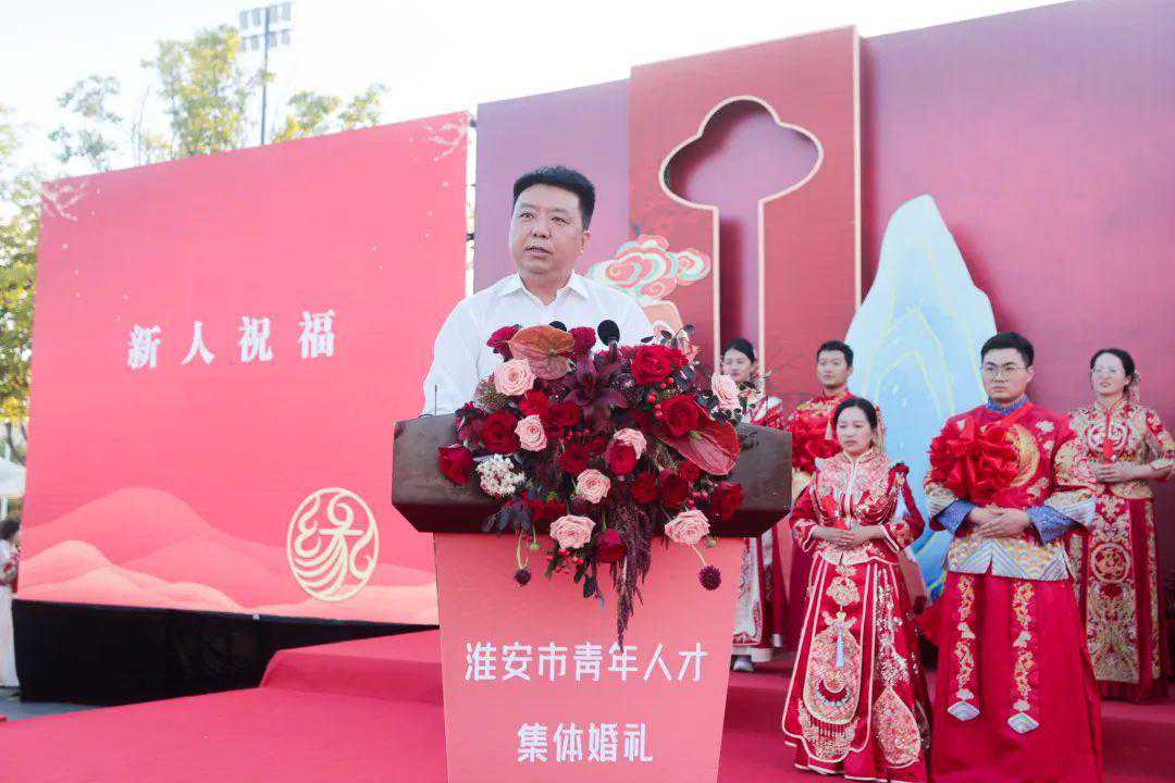 9月22日,由中共淮安市委、淮安市人民政府主办,淮安市委人才办、共青团淮安市委、淮安市民政局、江苏今世缘酒业股份有限公司、淮安市文化旅游集团股份有限公司联合承办的“缘定今生爱满淮安”2023年淮安市第四届青年人才集体婚礼在中国漕运城顺利举行。市委副书记、一级巡视员赵正兰,市委组织部副部长、老干部局局长、人才办主任姜洪洋,市民政局局长李萍,团市委书记刘浏,江苏今世缘酒业股份有限公司党委副书记、工会主席鲁正波,市文化旅游集团股份有限公司党委委员、副总经理杨文杰,团市委副书记胡晓等领导嘉宾出席活动。全市20对优秀青年人才新人代表及其亲友参加活动。