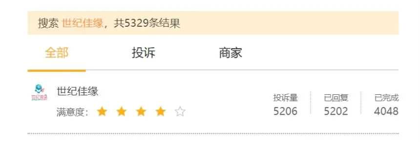 在黑猫投诉上,针对世纪佳缘的投诉多达5206个,反映的主要问题有诱导消费、虚假宣传、无故扣费、霸王条款、退费难等。