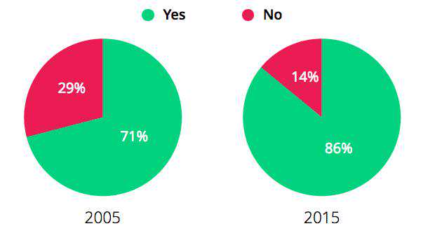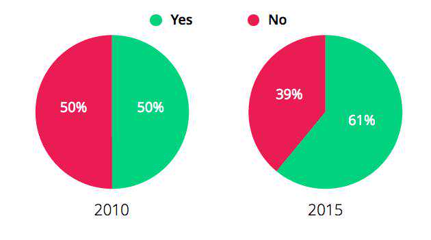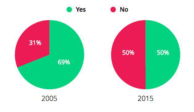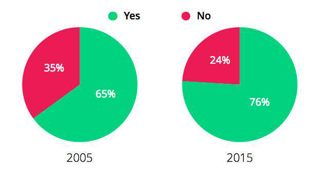 和十年前相比,回答“不”的人显然增加了。据Okcupid的数据显示,变化幅度最大群体是同性恋男子和异性恋女子,前者从83%降到57%,后者从48%降到25%。此外,表示愿意为了“约炮”而和对方上床的用户,和十年相比,从49%降到了41%。