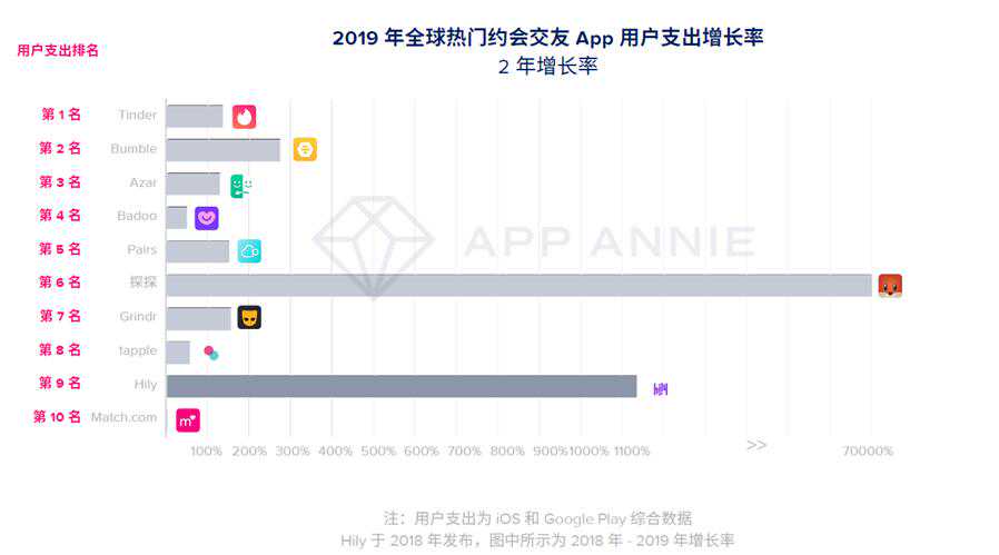 根据AppAnnie数据,在亚洲地区,来自日本市场的Pairs和Tapple分别在全球盈利能力方面排名第5位和第8位,韩国应用Azar在全球用户支出排行榜中位居第3名。来自中国市场的探探位居第六,但它从2017年到2019年增幅约为70,000%,增长跨度全球最大。