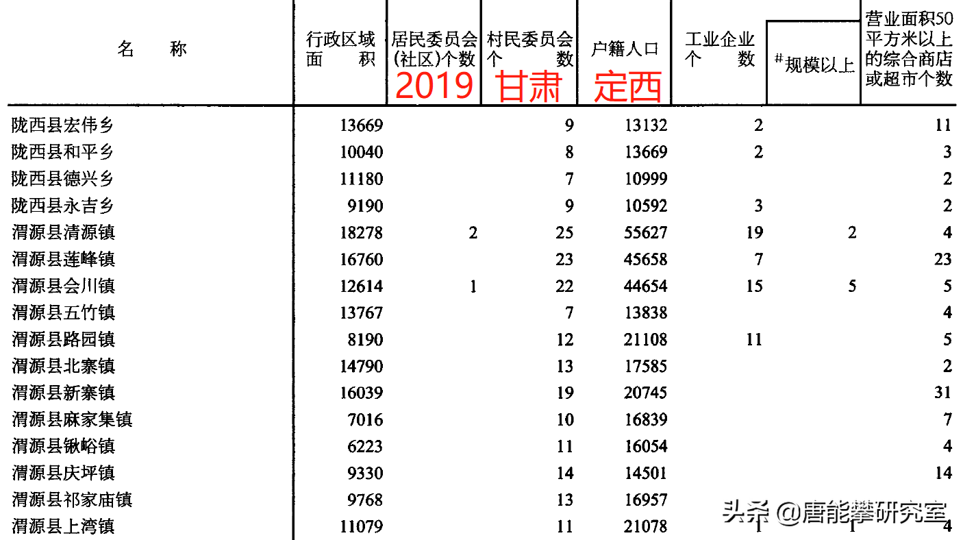 甘肃定西通渭、渭源、陇西3县51镇人口、土地、工业…最新统计