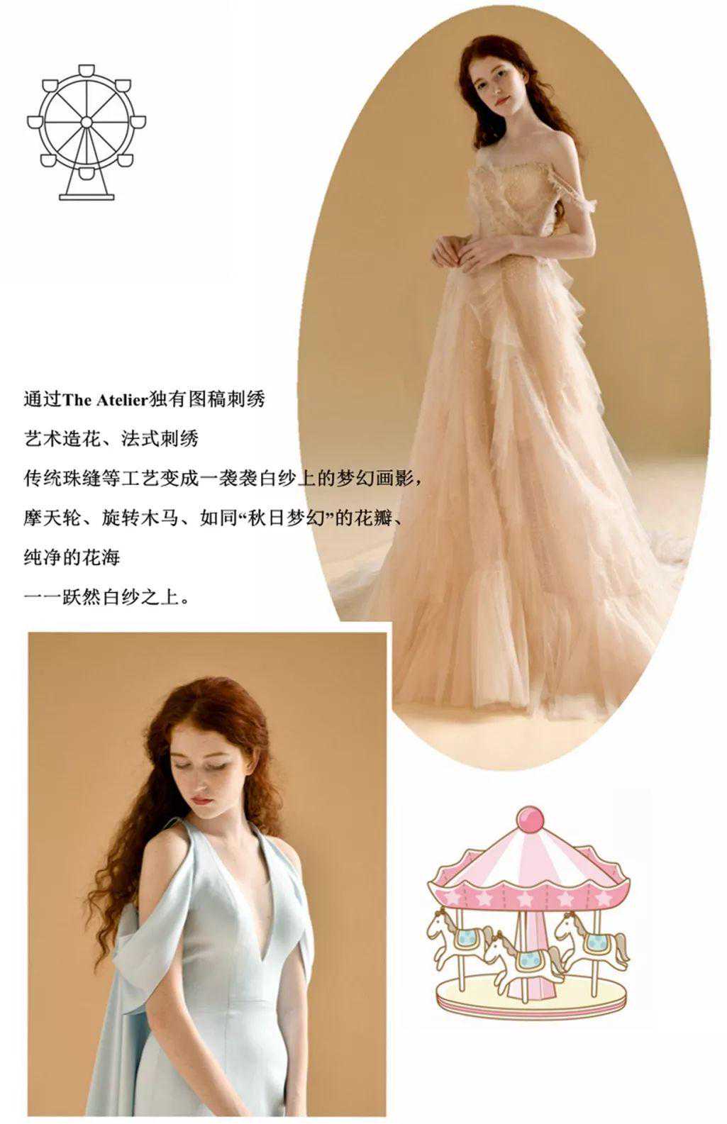 YEW:童话是现实里一直被追逐的阿拉丁,每一个人都曾梦想,都曾期待属于自己的奇妙物语。此次的TheBridalNewCollection以“梦幻童话”为主题,将寓意童话通过TheAtelier独有图稿刺绣、艺术造花、法式刺绣、传统珠缝等工艺变成一袭袭白纱上的梦幻画影,摩天轮、旋转木马、如同“秋日梦幻”的花瓣、纯净的花海等,一一跃然白纱之上。此次秋冬系列我们以纯净之心呈现TheBridal系列经典梦幻版奢华婚纱,或纯粹、或清新、或光彩,每一款白纱的背后都是美好的愿景,每一位女生都应该去梦想一个没有丢失童话的世界,给自己一个梦幻的童话色彩世界。