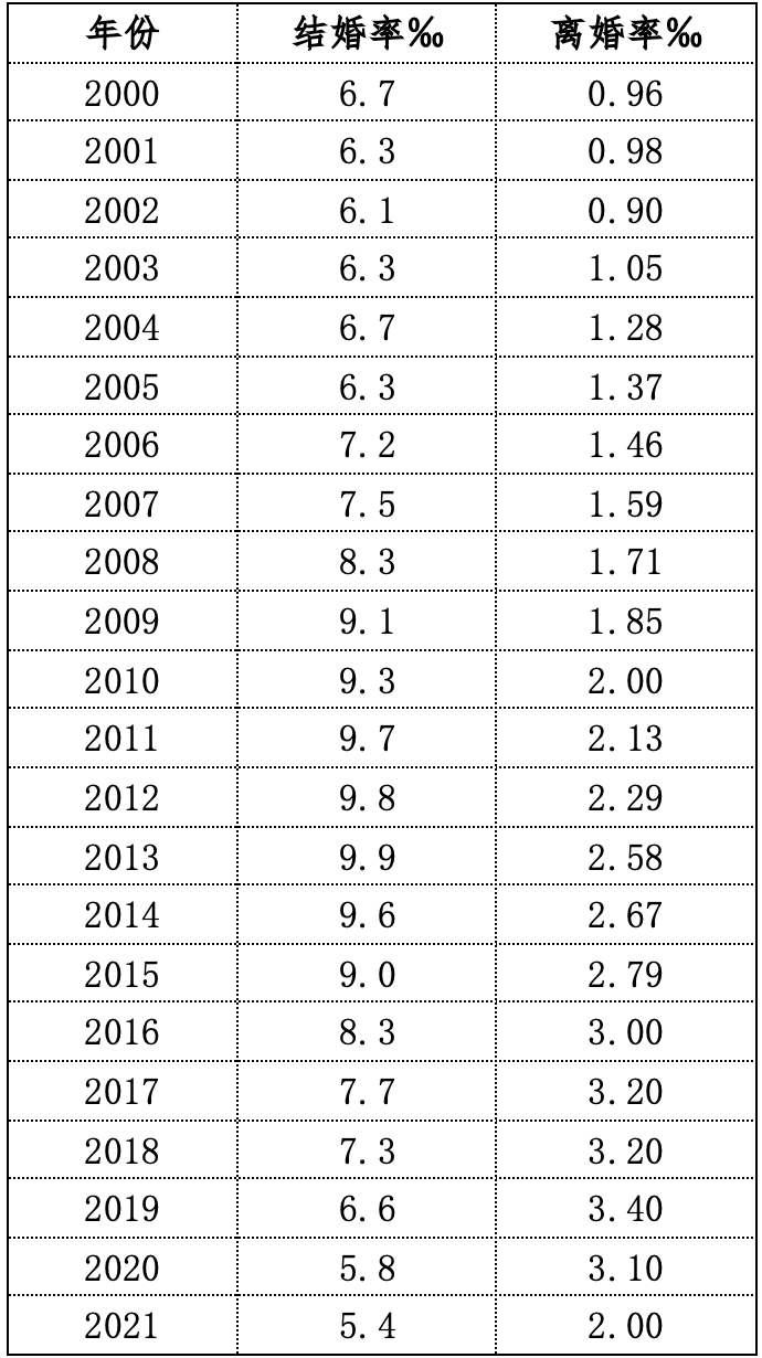 下表是中国2000-2021年结婚率和离婚率: