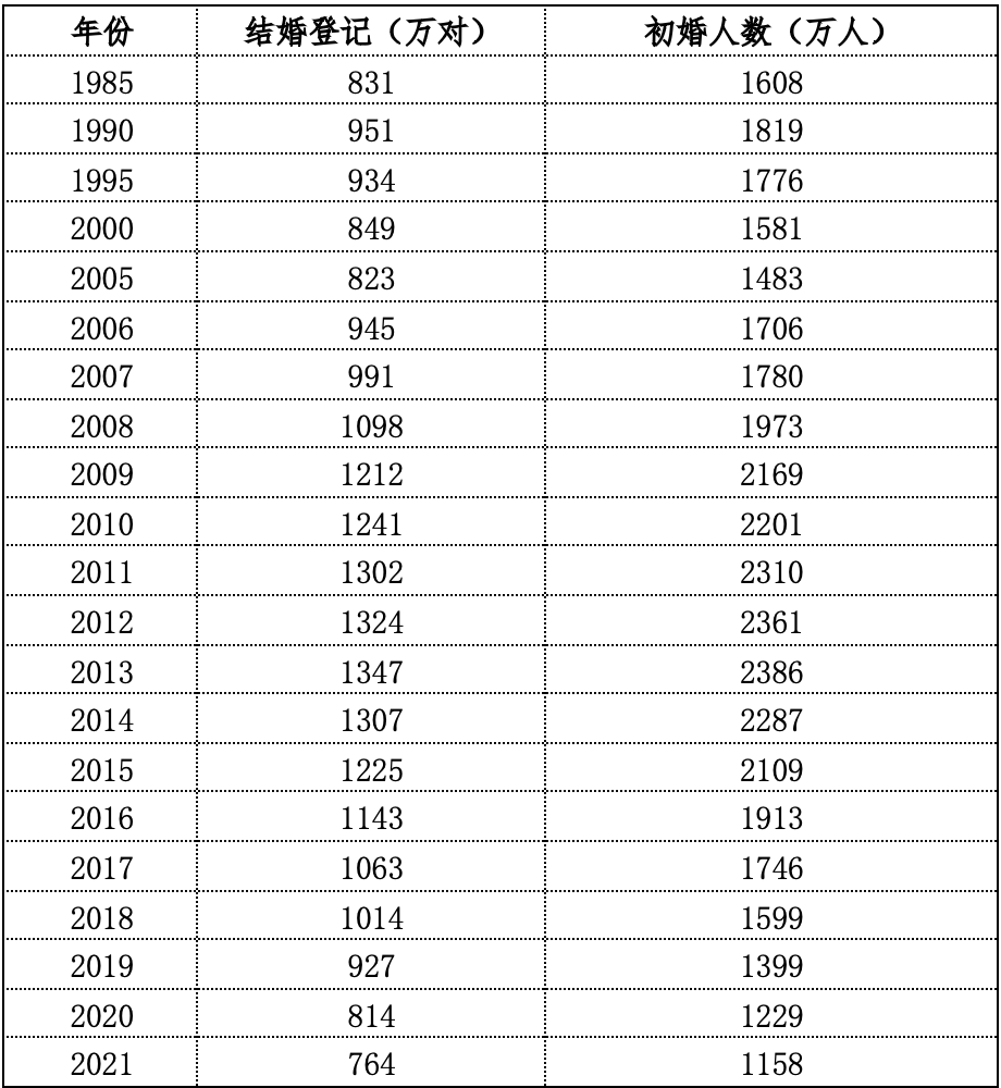 下表是中国1985年以来结婚对数和初婚人数。