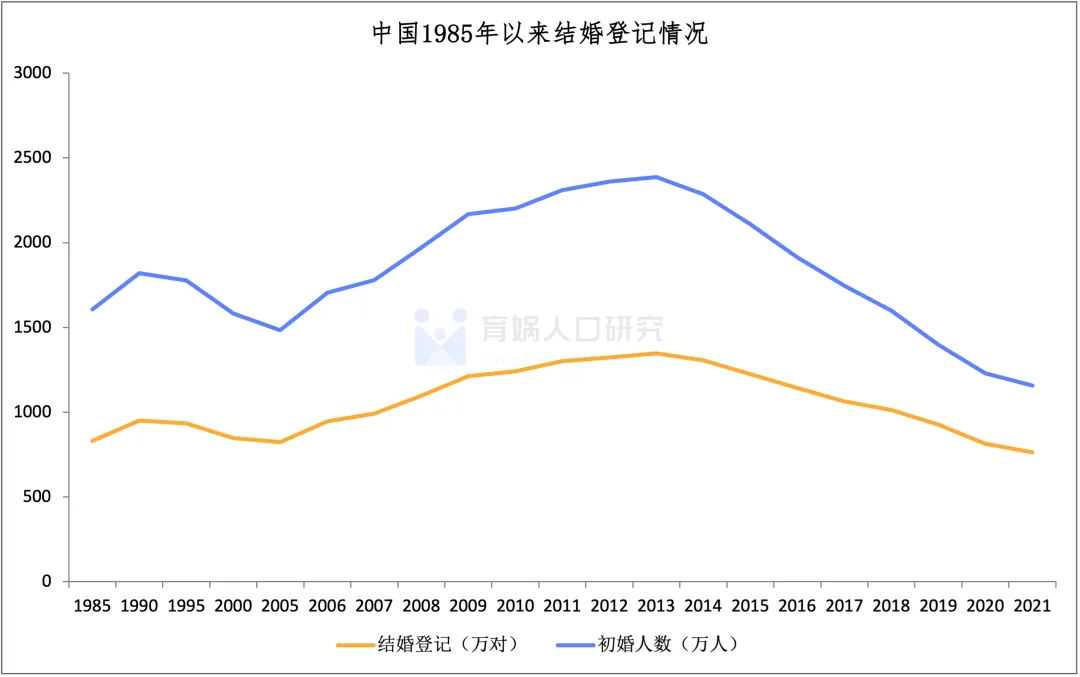 我国初婚人数在2013年达到2386万人的峰值后持续下降,2021年下降到1158万人,比2013年下降51.5%。2013年,我国结婚登记对数为1347万对,2022年结婚登记对数下降到683万对,连续九年下降。