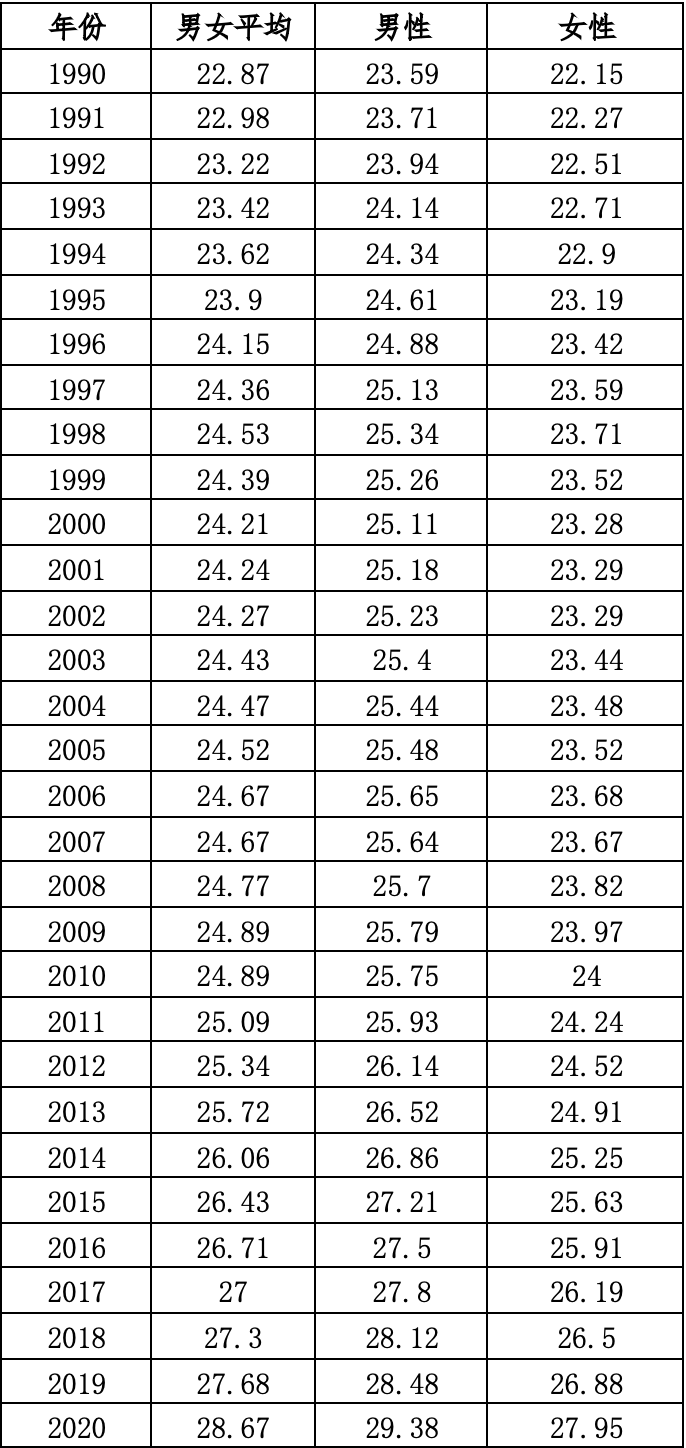 1990年我国男性平均初婚年龄为23.59岁,女性为22.15岁;2000年男性平均初婚年龄上升到25.11岁,女性上升到23.28岁;到2020年,男性平均初婚年龄上升到29.38岁,女性上升到27.95岁。