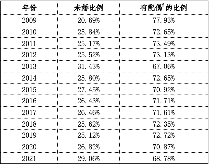 我们根据2010-2022年的中国人口和就业统计年鉴,整理出2009-2021年20-39岁女性的未婚和已婚比例如下表: