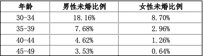 从上表可以看出,30-49岁各年龄段的男性未婚比例均高于女性。