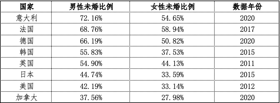 从上表可见,2019年日本平均初婚年龄为男性31.2岁,女性29.6岁;韩国为男性33.4岁,女性30.6岁;美国为男性29.8岁,女性28岁;欧盟27国平均初婚年龄为男性33.3岁,女性30.7岁。