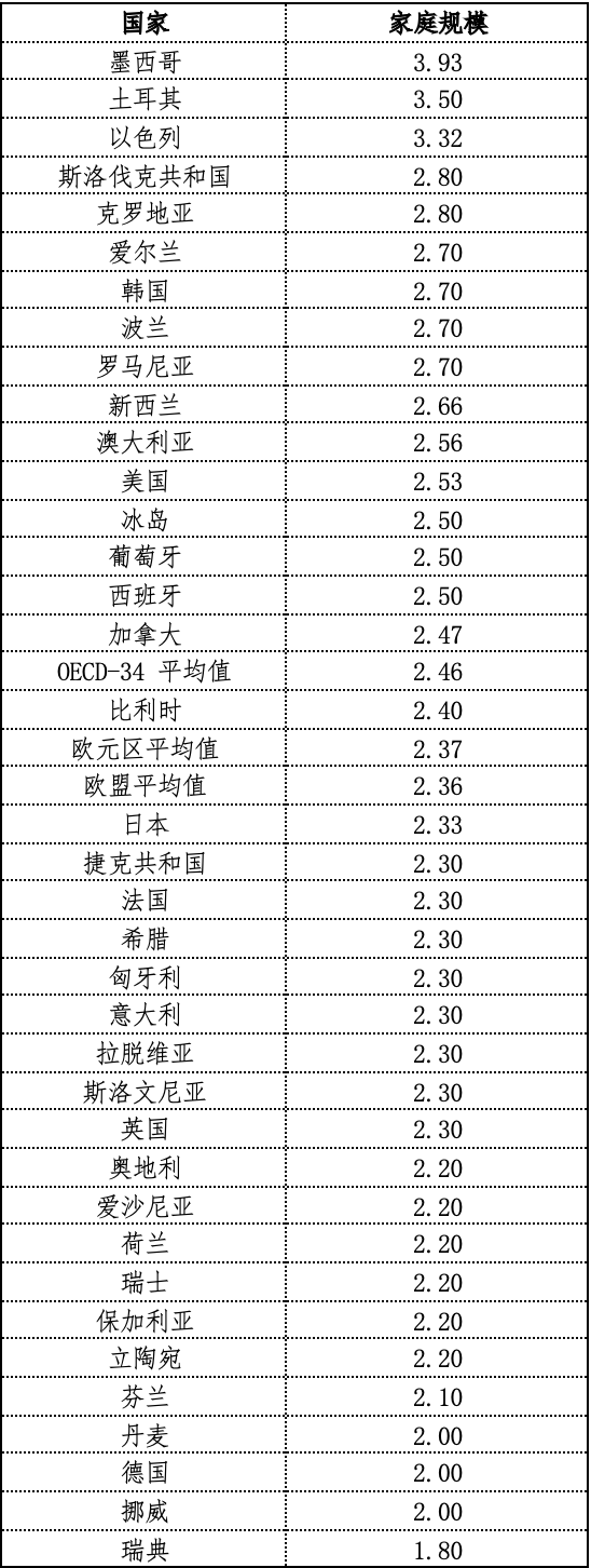 从上表可以看出,经合组织国家平均家庭规模为2.46,而瑞典的家庭规模最小,仅有1.8人。