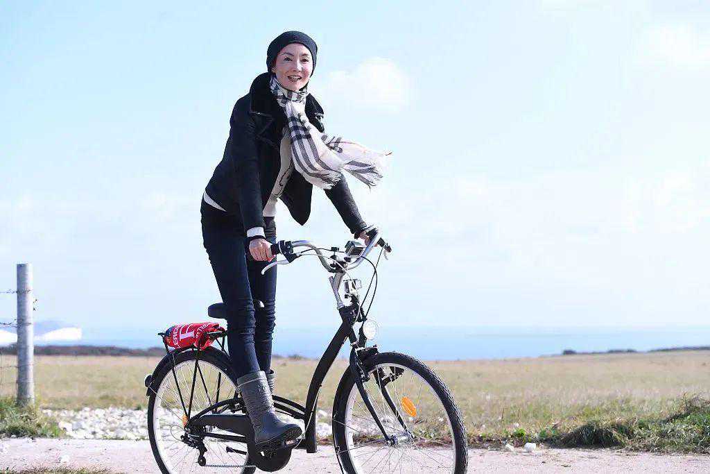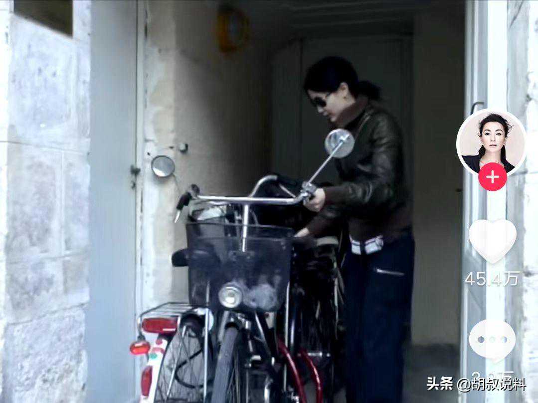 她只是随意穿了一件皮衣,推着自行车,在街边慢悠悠地走着。