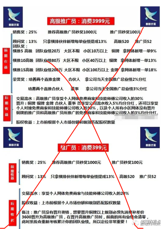 那喜鹊优服倒是不是资金盘呢?很多人狡辩说这项目是一个要落地的线下服务销售平台,平头哥于是去大概了解了一下,却发现所谓的喜鹊优服不过是一个传销资金盘,而他的前身优人帮也曾因传销被处罚过。