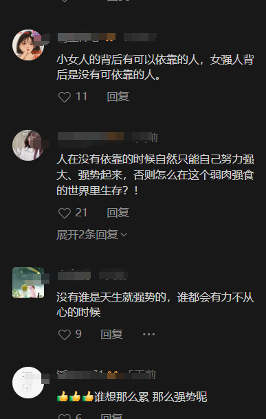 2019年她接受采访时说:“没有谁生下来是天生就强势的,一定是你处在了这种环境,比如说你依靠不了别人,你必须自己变得强大,你就会越变越强大,所以你们来问我秘诀、根本就没有……”