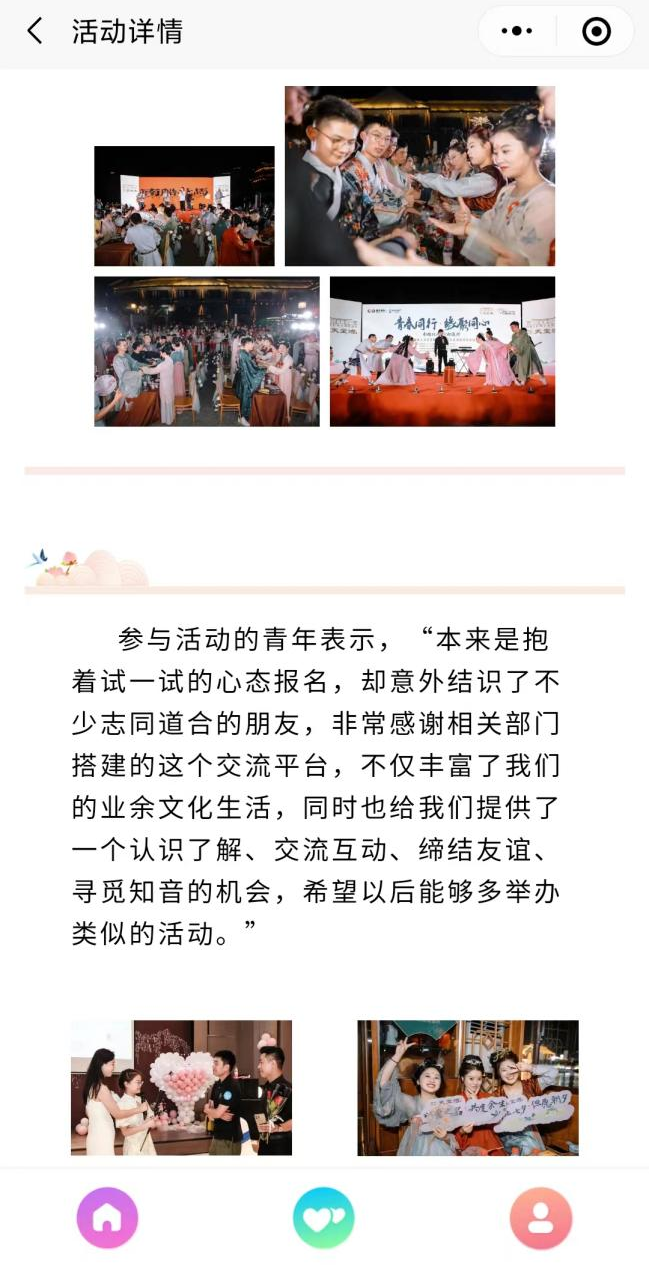 “淮青缘”将定期发布“青春同行缘聚同心”淮安青年人才交友联谊系列活动,在活动页面查看正在进行中的活动,信息完善的用户可以报名参与,后续等待审核。