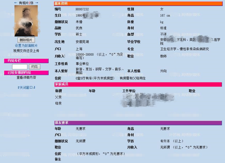 像这种相亲提的要求高得离谱或者另类的,男女都有。有个牵手成功的会员推荐朋友过来,这个女生是1983年出生的,她注册时的择偶要求我们觉得可以做到。但在服务过程中,她就开始层层加码,要求越来越高,到最后要求找一个能在上海工作的外籍华裔高管,长相要好,最好还能接受去海外代孕。我们通过社会关系,在美加的华人圈子里刊登了征婚广告,终于找到一个各方面条件都比较合适的。这个男生在加拿大工作,但父母都在上海生活,而且年底就回国。为了确保身份信息可靠,我们还专门约了男生的父母见面,由父母代填了表格。照片发给这个女生,她就说了一句没眼缘,直接pass。这样几次之后,我们只能跟她讲,她的要求超过了我们的能力范围。