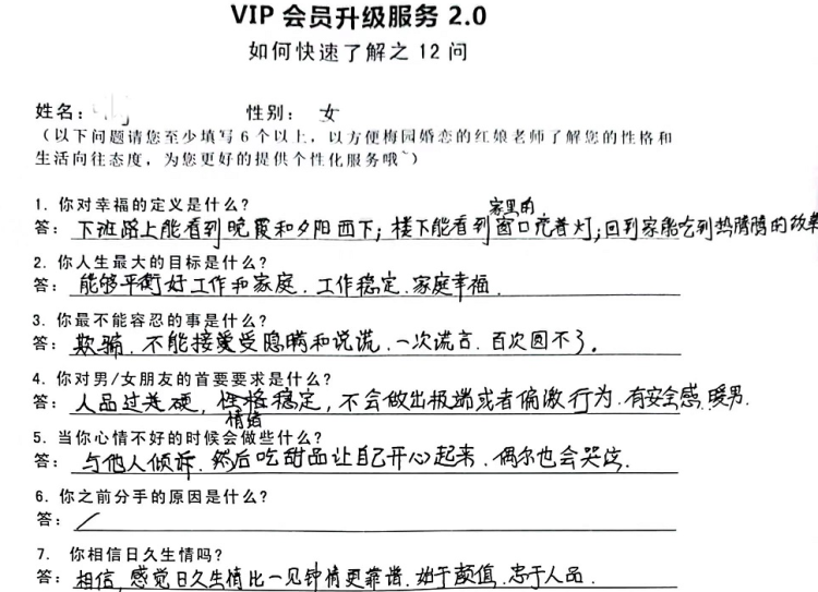 在注册会员的时候,除了基本信息,我们还会让他们填写一份问卷,包括12个问题,比如:你之前分手的原因是什么?你对男/女朋友的首要要求是什么?你最不能容忍的事是什么?你一个人的时候都做些什么?等等。这些都有助于我们了解他们内心的真实需求。哪怕有些看似不合理的要求,也一定能反映出一些真实的情况。