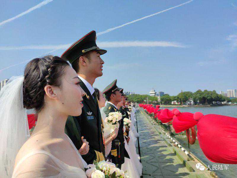 东湖东岸的门桥上,40位身着笔挺礼服的官兵翘首以盼;西岸的门桥上,40位身着雪白婚纱的新娘笑靥如花。不远处岸上的亲友团早已沸腾开来,目不转睛地盯着湖中央正在缓缓靠近的两座“鹊桥”。